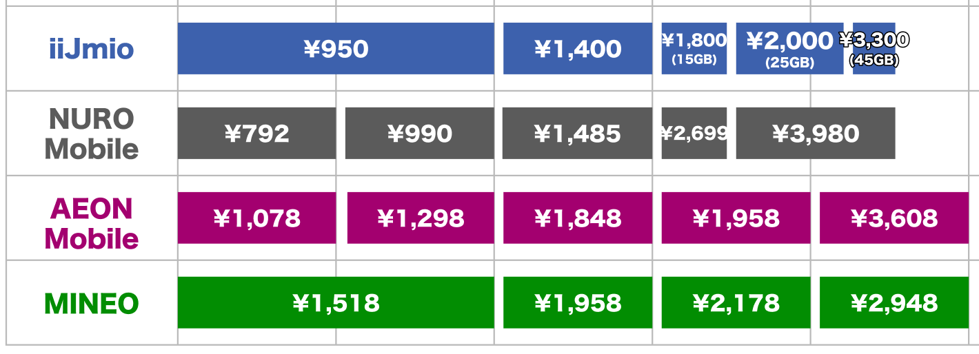 似たような価格設定だとNuro Mobile、Aeonモバイル、Mineoも十分安い。その中でも、データ容量毎で比較するとIIJmioが最安。