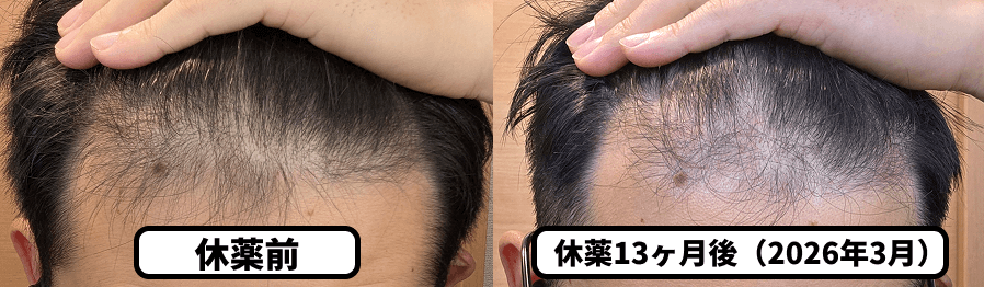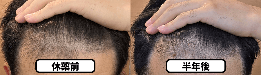 • フィナステリド休薬による毛髪の変化:休薬3ヶ月目から抜け毛が増加。現在は↑の通り