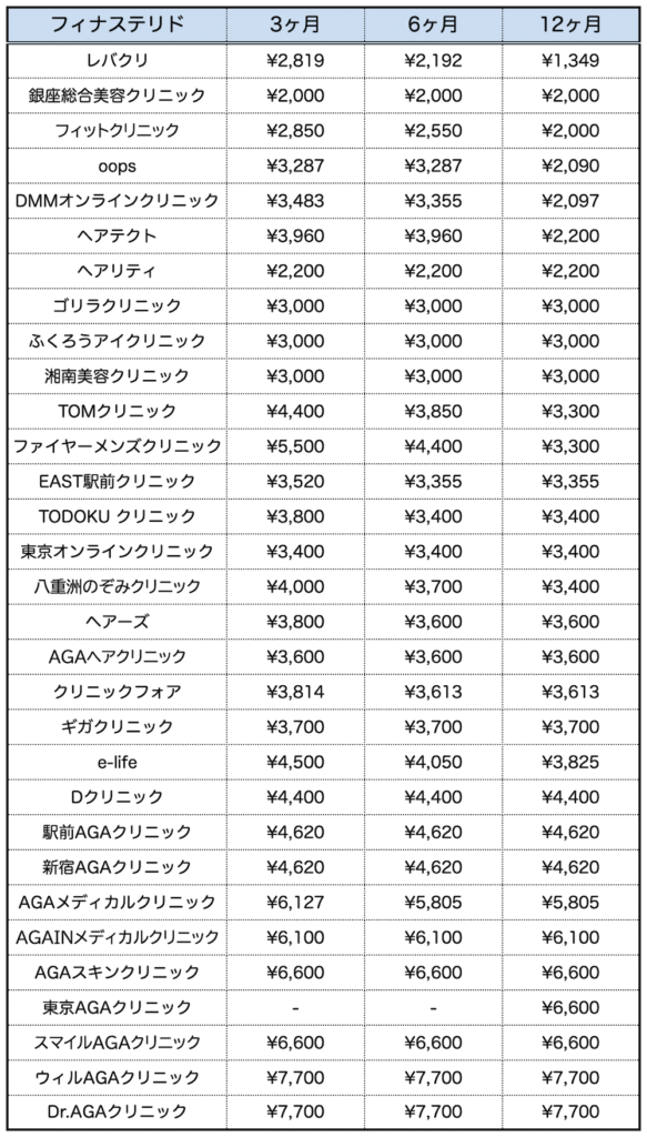 - 金額は各社フィナステリドの最小容量の価格を記載