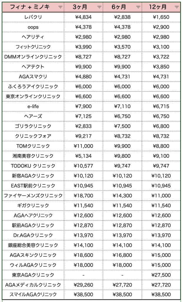ということで、ここまでの内容を踏まえてAGAクリニック32社の「フィナステリド」と「フィナステリド + ミノキシジル」それぞれの価格をまとめたのが下記。